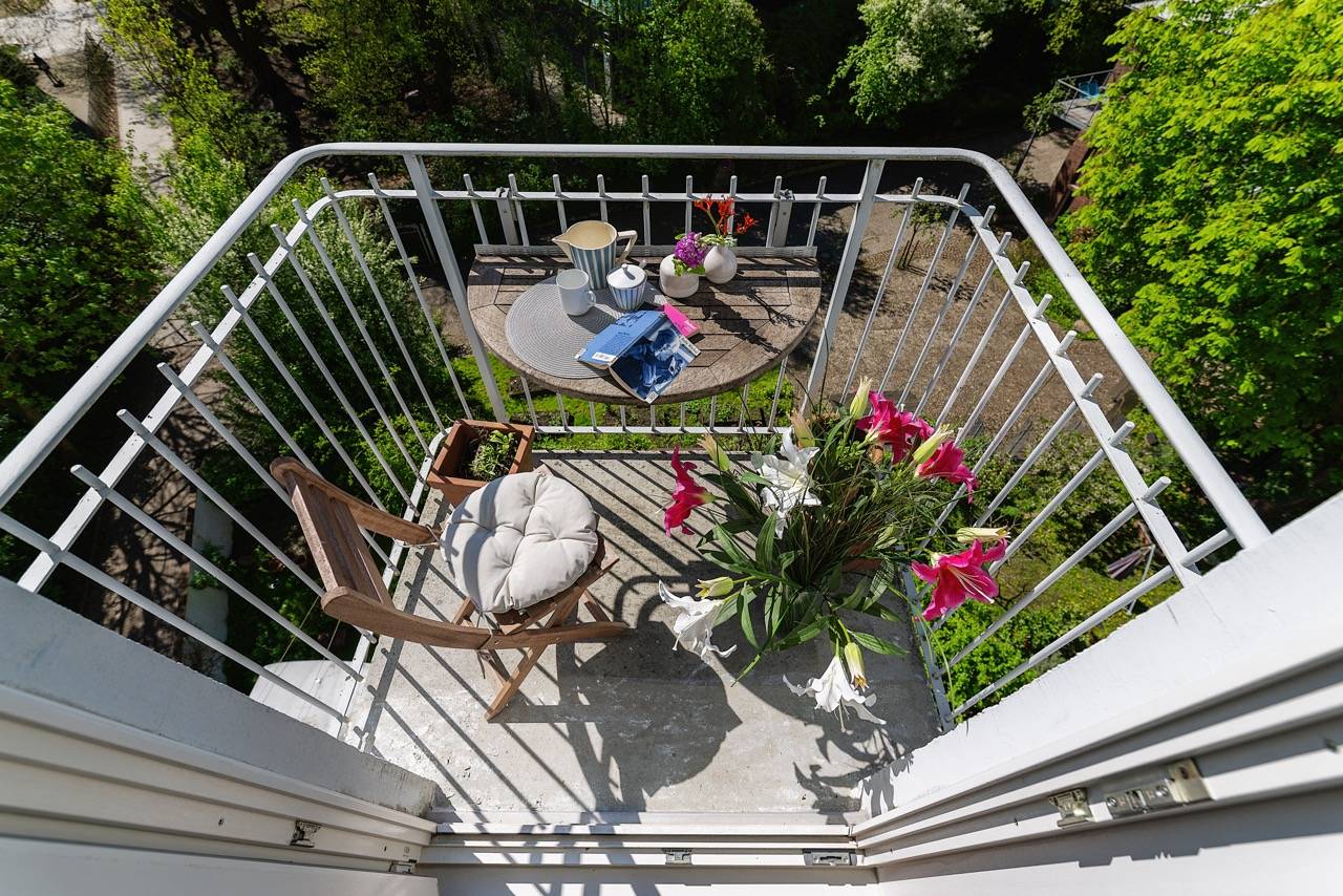 • Balkon/Terrasse: 2 Balkone, 1 nach hinten (SSW), 1 nach vorne (NNO)