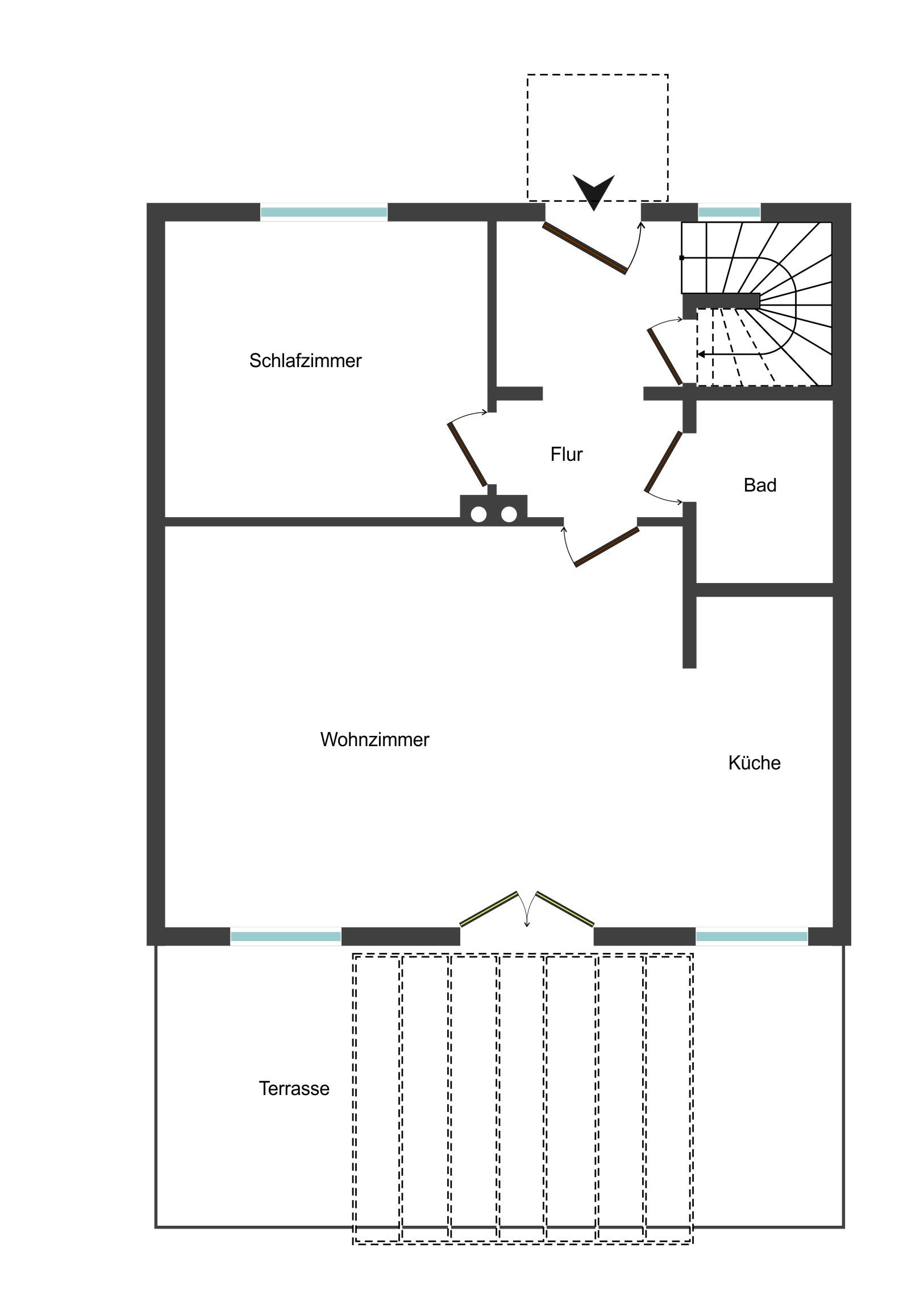 Links liegt 1 Gäste-WC mit Dusche – kuschelig warm dank zusätzlicher Fußbodenheizung. Rechts flattern Sie in das große Kinderzimmer. Herzstück ist aber das luftige Wohnzimmer mit offener Einbauküche. Das Schönste: der freie Blick auf die Sonnenterrasse aus Holz, wo 1 moderne Überdachung für windstille Ruheplätze auch noch im Herbst sorgt.