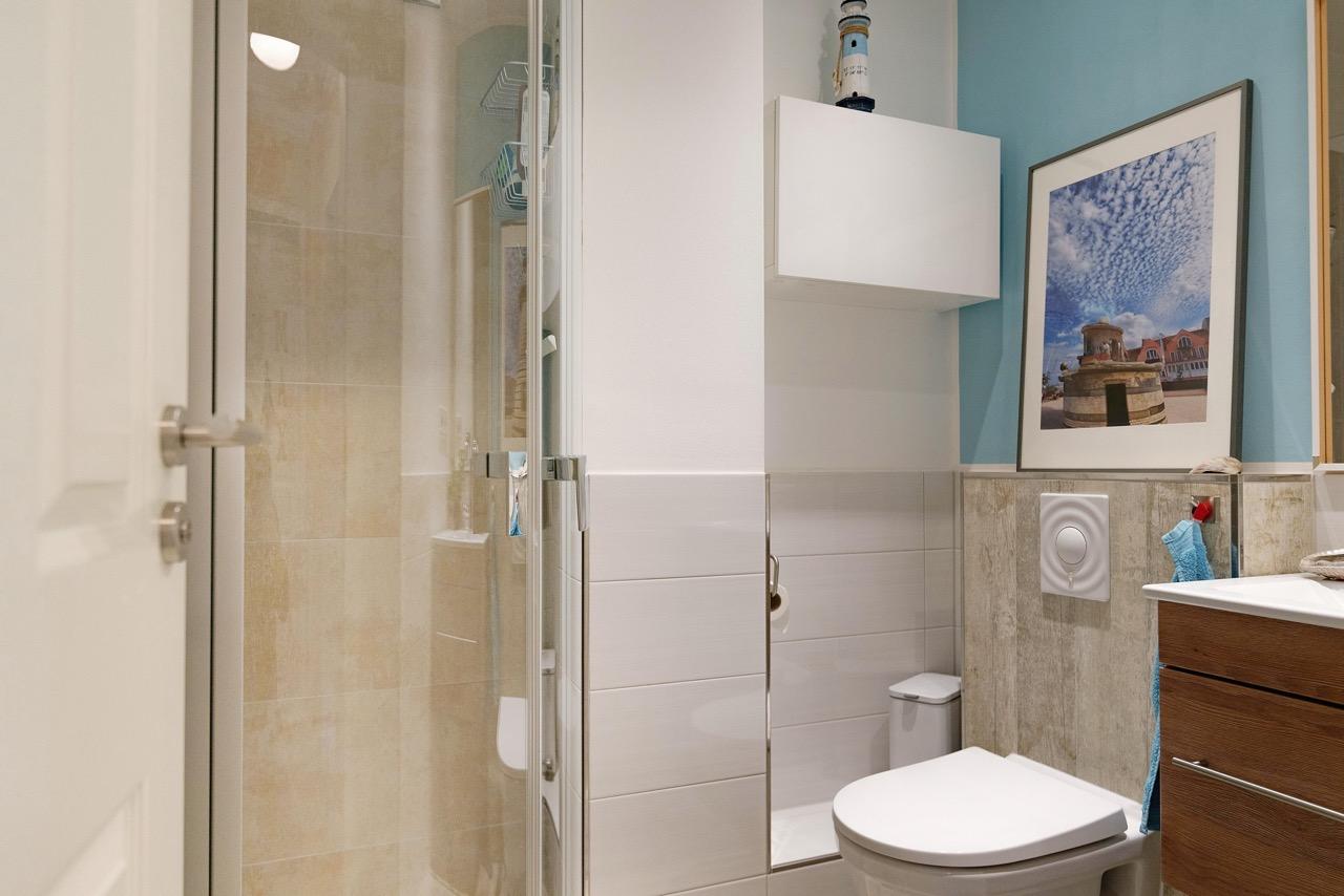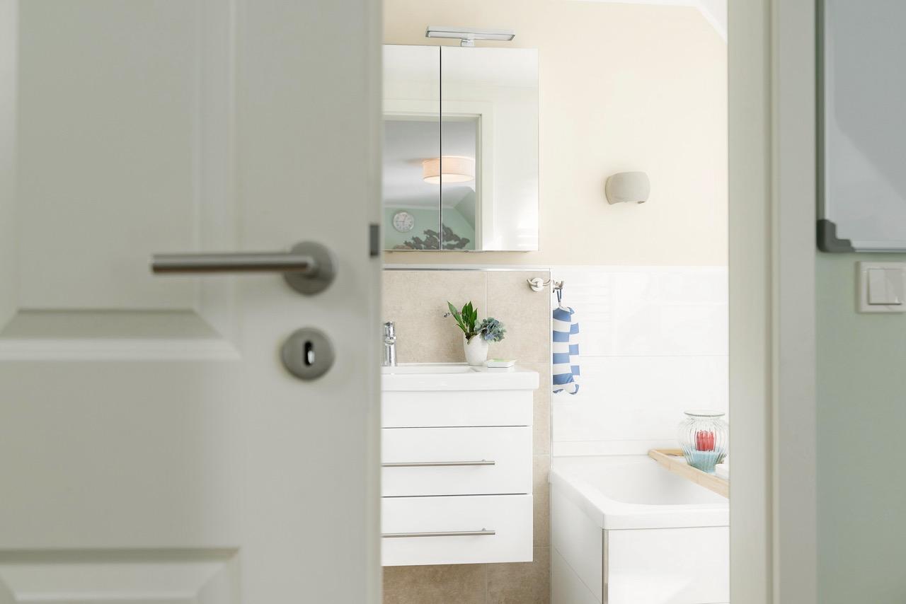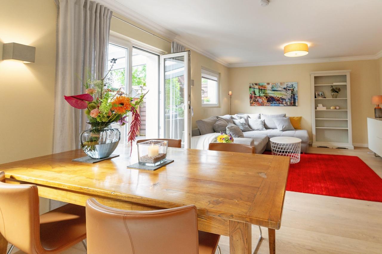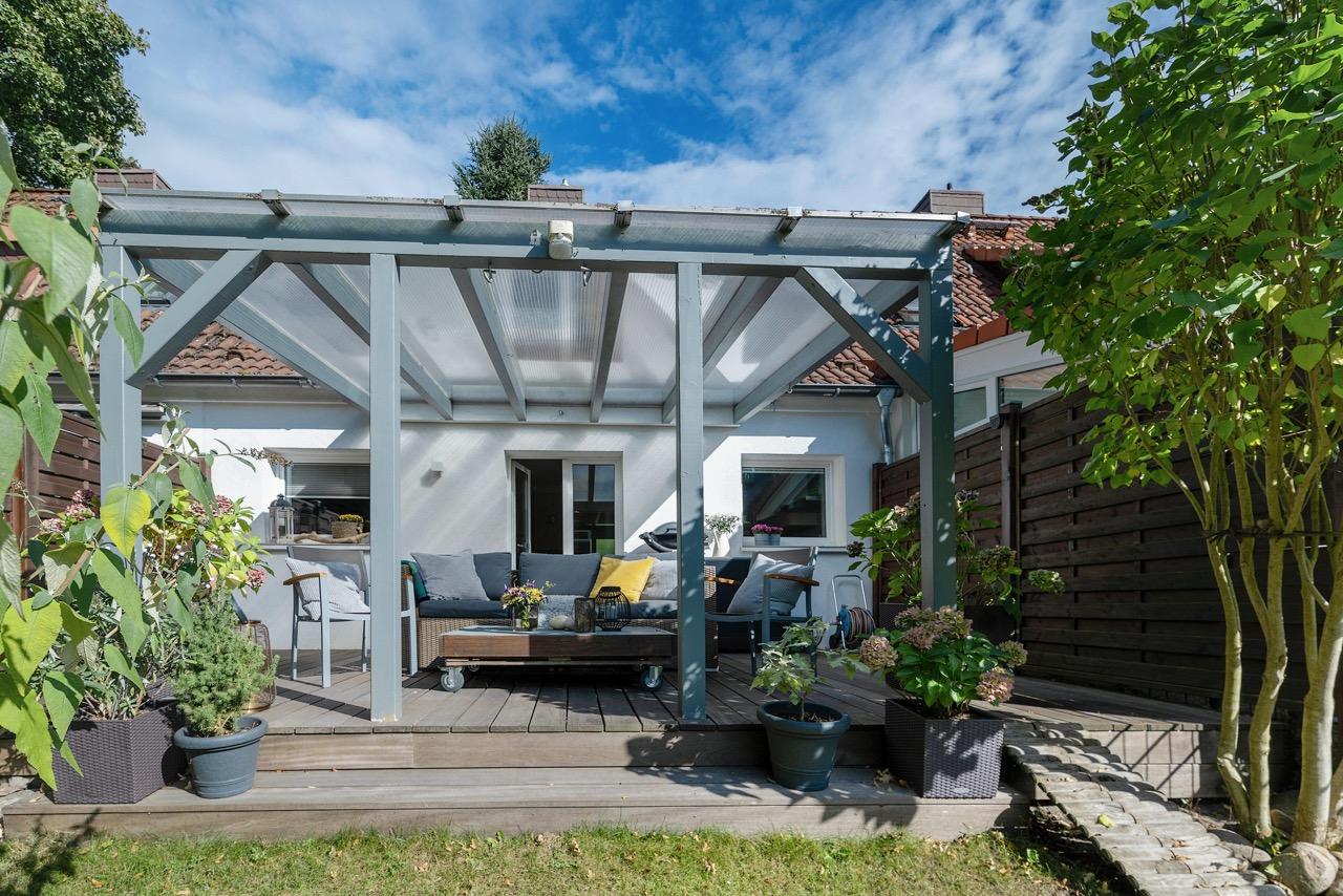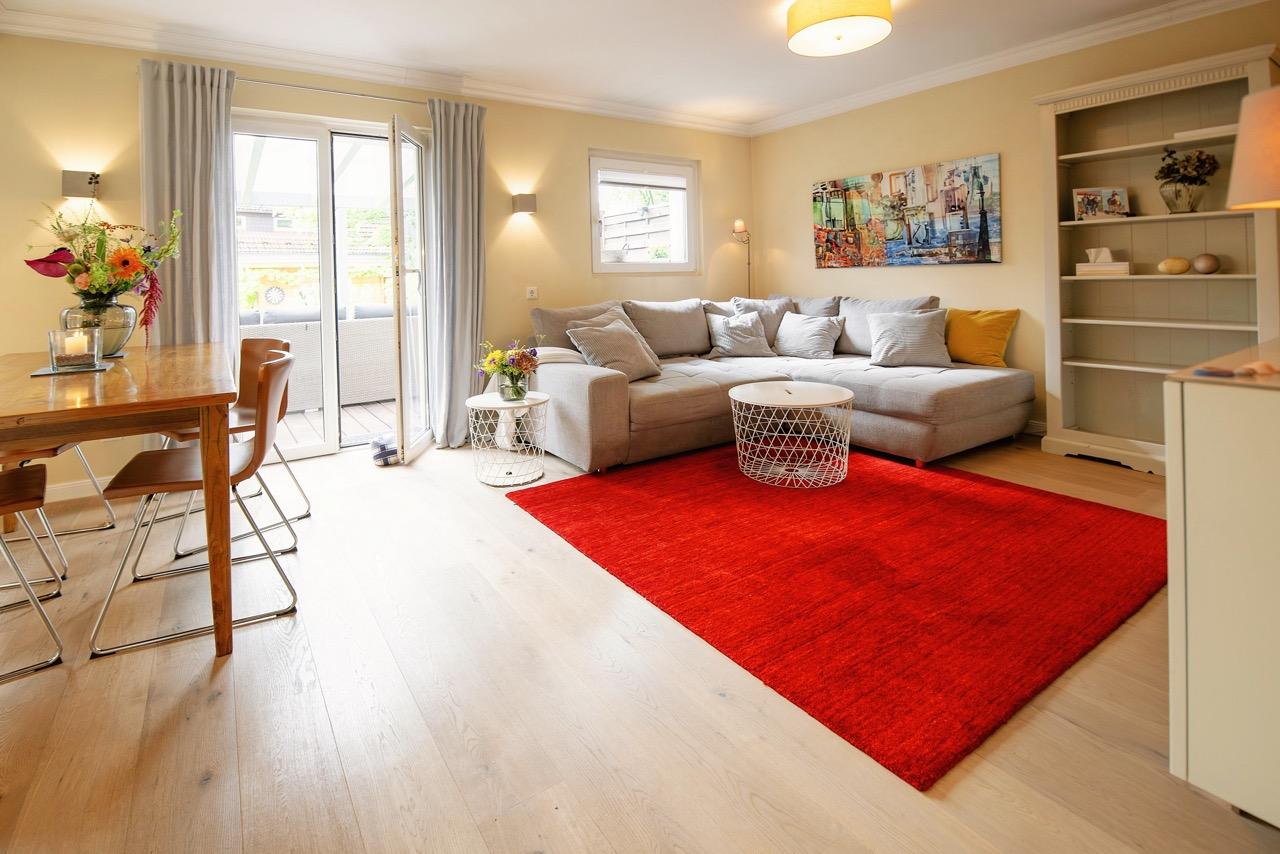 Links liegt 1 Gäste-WC mit Dusche, rechts flattern Sie in das große Kinderzimmer. Herzstück ist aber das luftige Wohnzimmer mit offener Einbauküche – beides kuschelig warm dank Fußbodenheizung. Das Schönste: der freie Blick auf die Sonnenterrasse aus Holz, wo 1 moderne Überdachung für windstille Ruheplätze auch noch im Herbst sorgt.