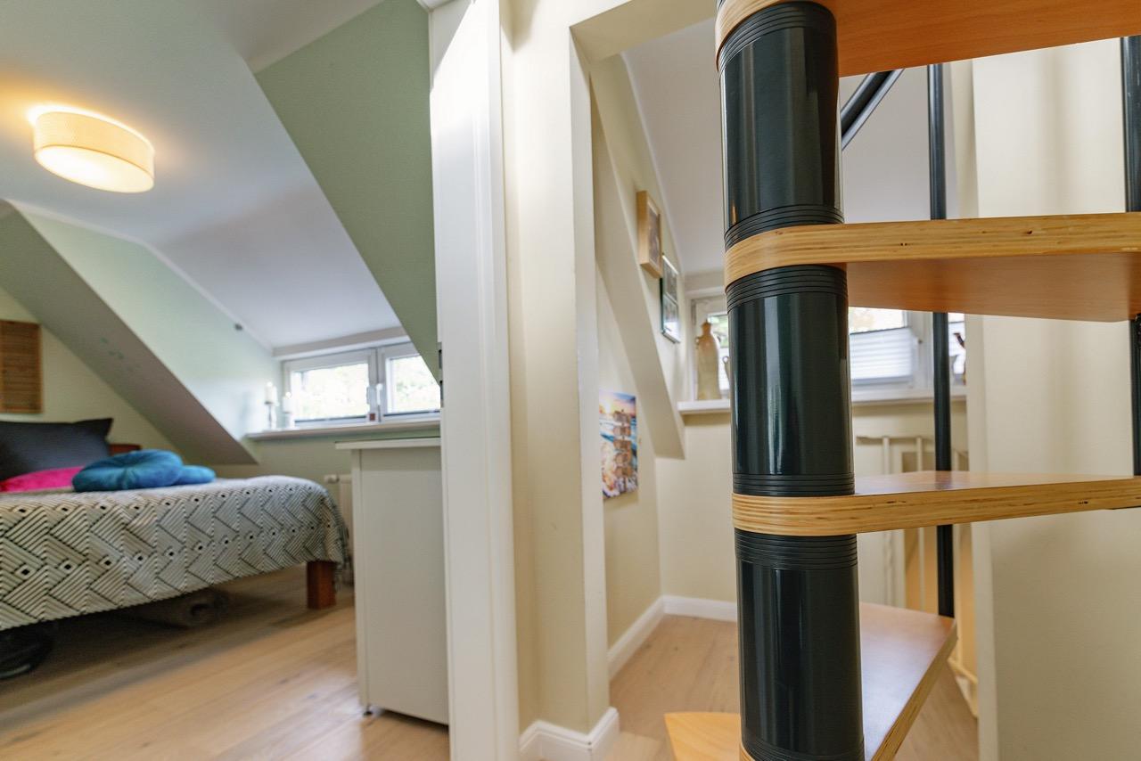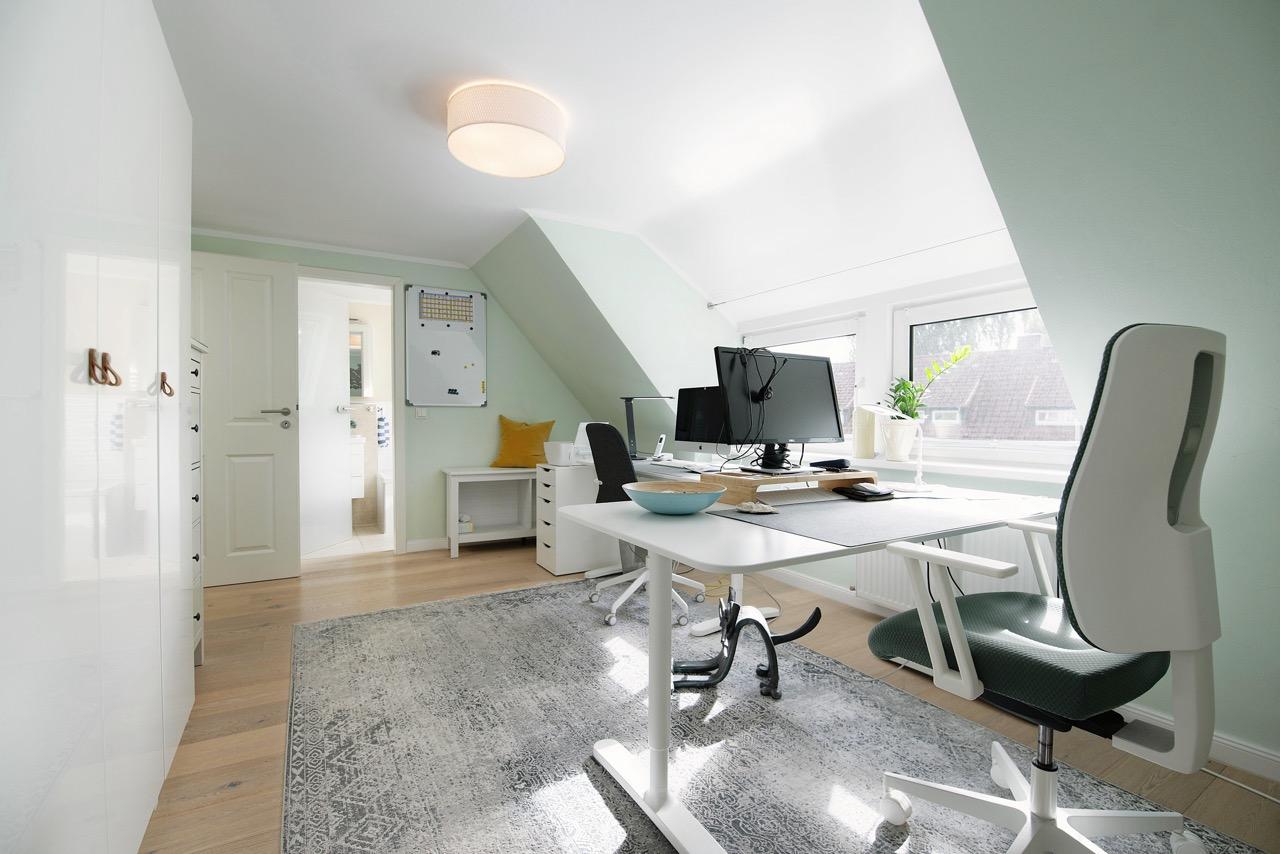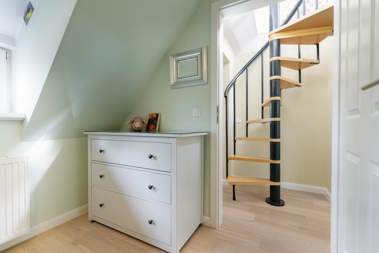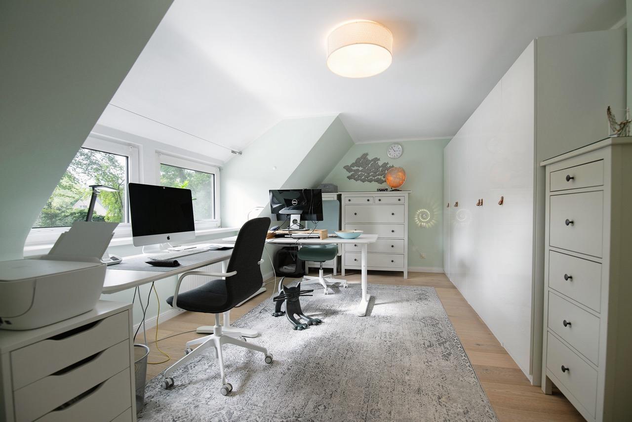 Im Obergeschoss warten 2 weitere Zimmer: 1 gemütliches Schlafnest & 1 großzügiges Arbeitszimmer. Von hier flattern Sie durch 1 Glastür direkt ins Wellness-Bad mit Dusche & Wanne – modern in Beige-Weiß. Aus dem kleinen Flur windet sich 1 Wendeltreppe hinauf ins Dachnest: 2018 ausgebaut mit kuscheligem weißen Teppich & hellen Dachfenstern. Zudem ist das Haus unterkellert mit Waschküche, Heizraum & große Vorratskeller.