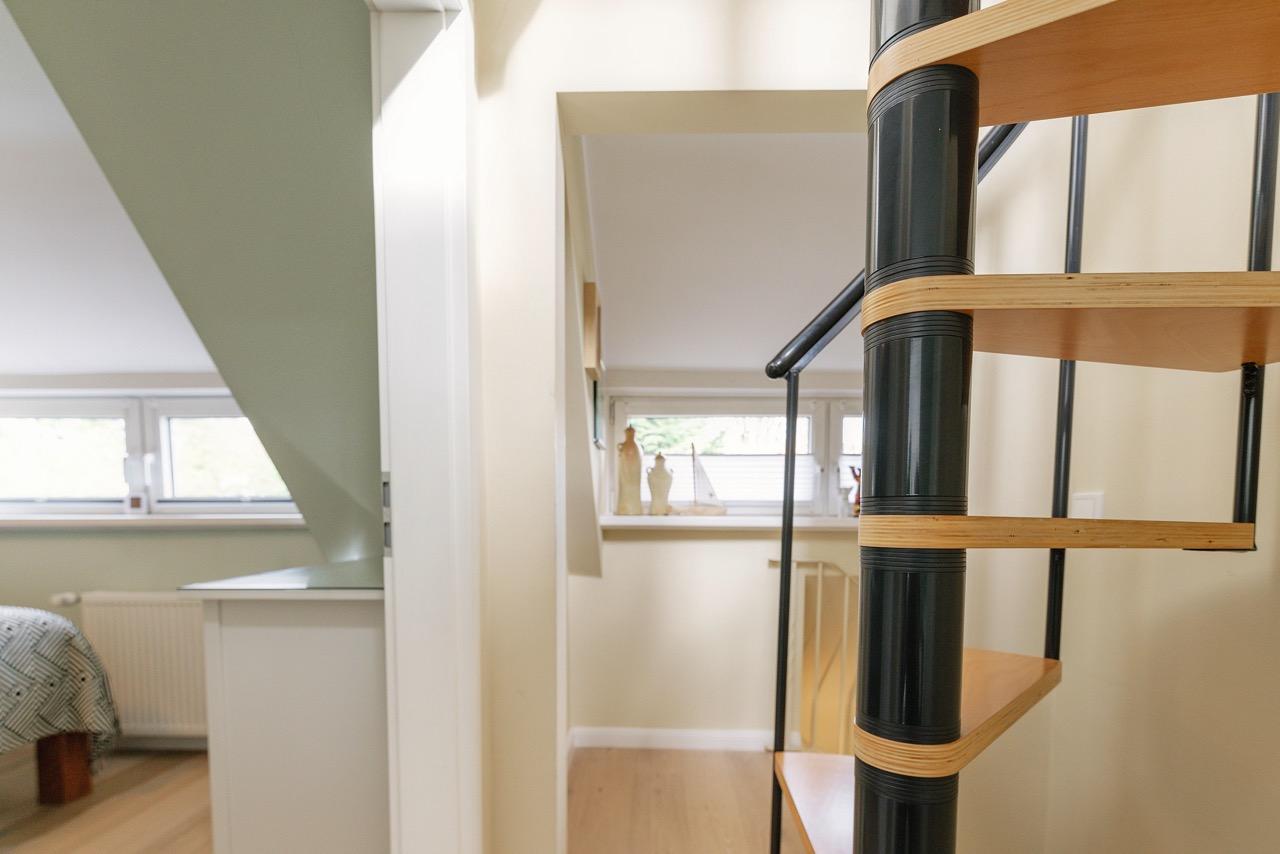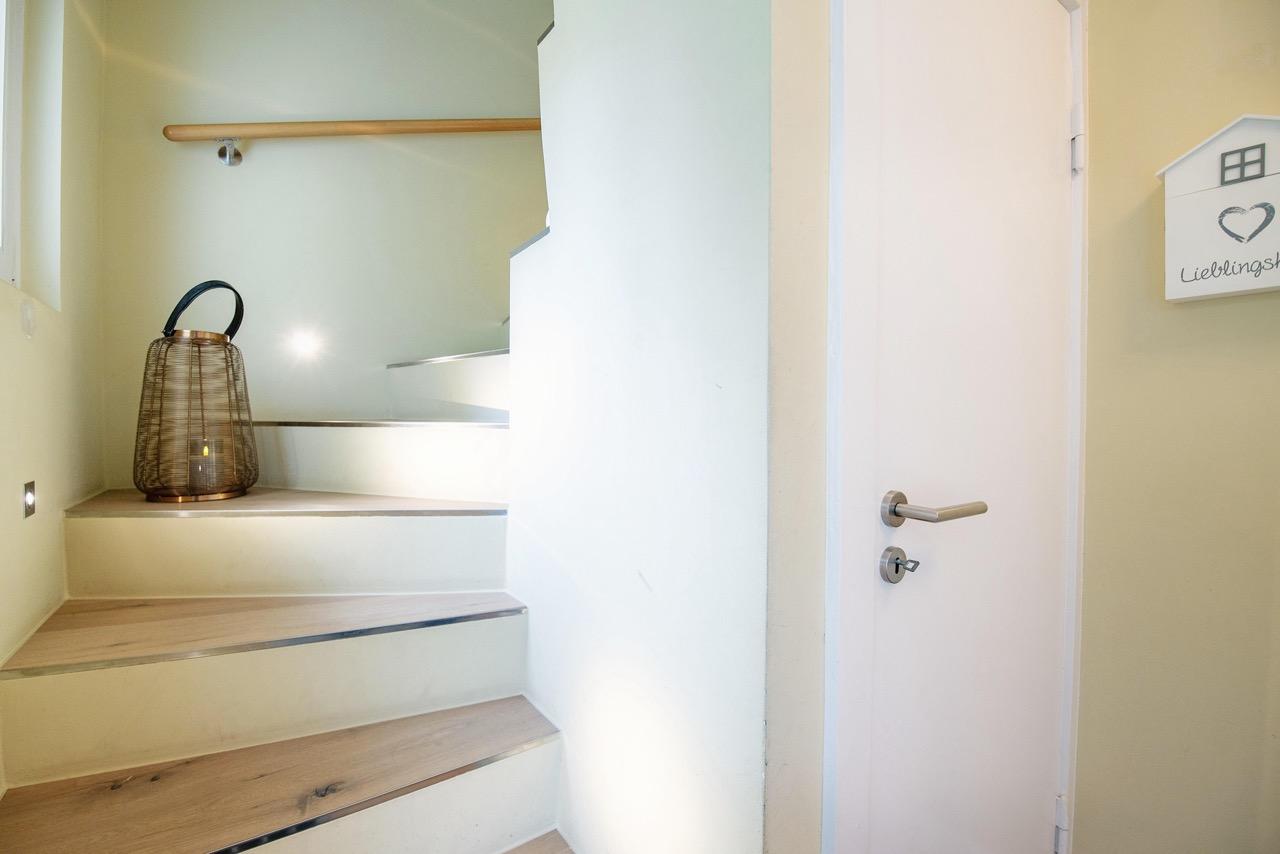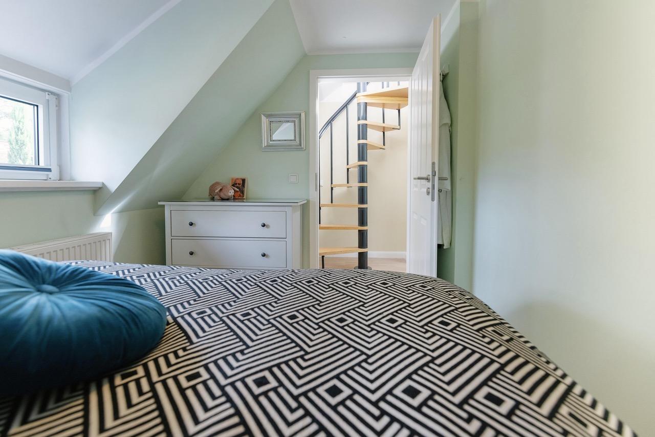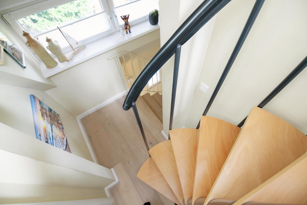 Im Obergeschoss warten 2 weitere Zimmer: 1 gemütliches Schlafnest & 1 großzügiges Arbeitszimmer. Von hier flattern Sie durch 1 Glastür direkt ins Wellness-Bad mit Dusche & Wanne – modern in Beige-Weiß. Aus dem kleinen Flur windet sich 1 Wendeltreppe hinauf ins Dachnest: 2018 ausgebaut mit kuscheligem weißen Teppich & hellen Dachfenstern. Zudem ist das Haus unterkellert mit Waschküche, Heizraum & große Vorratskeller.