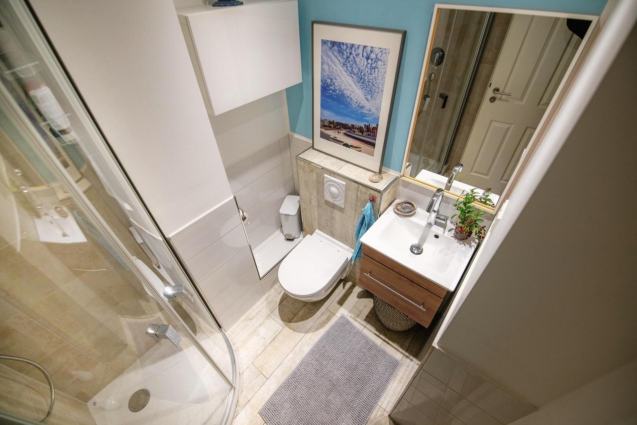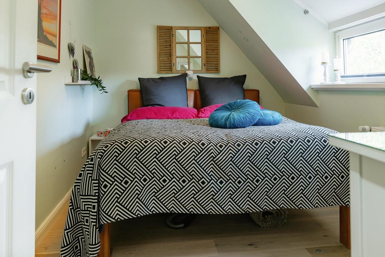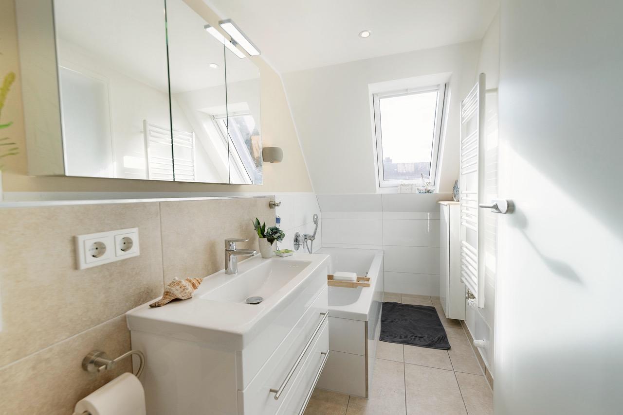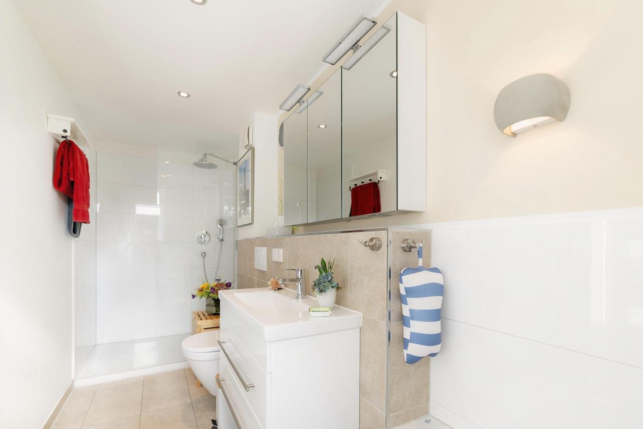 Im Obergeschoss warten 2 weitere Zimmer: 1 gemütliches Schlafnest & 1 großzügiges Arbeitszimmer. Von hier flattern Sie durch 1 Glastür direkt ins Wellness-Bad mit Dusche & Wanne – modern in Beige-Weiß. Aus dem kleinen Flur windet sich 1 Wendeltreppe hinauf ins Dachnest: 2018 ausgebaut mit kuscheligem weißen Teppich & hellen Dachfenstern. Zudem ist das Haus unterkellert mit Waschküche, Heizraum & große Vorratskeller.