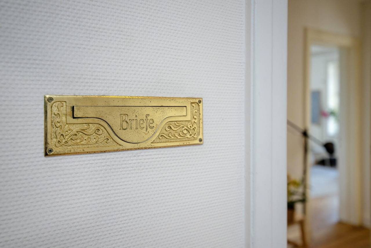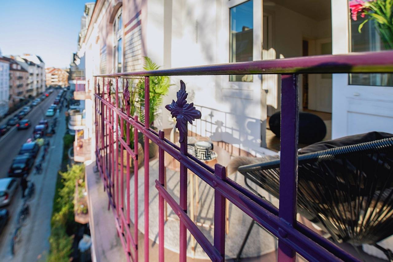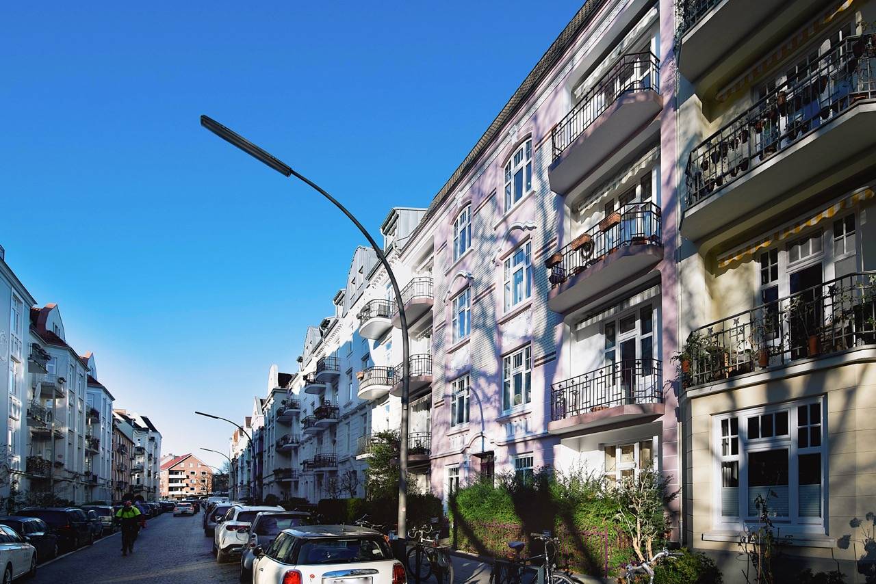 Baujahr 1906 mit zartrosa-weißer Frontfassade & weinroten Balkonen. Ein sehr gepflegtes Haus, um das sich die Eigentümergemeinschaft rührend kümmert. Das Treppenhaus hat 1 bemerkenswerte Stuckleiste im Entrée – achten Sie auf die kleinen grünen Frösche. Das Haus steht unter Denkmalschutz.
