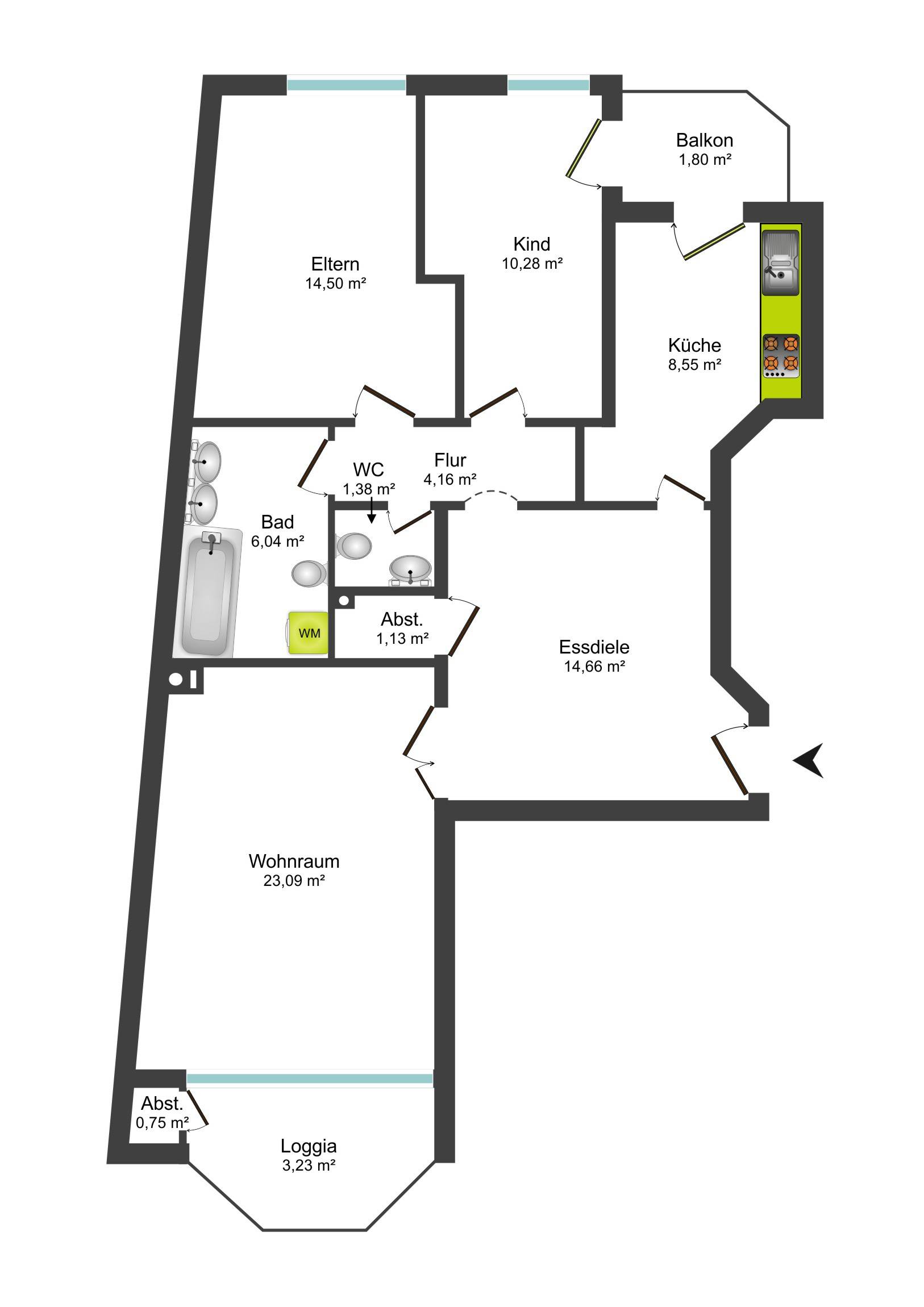Kurzer Rundflug! Sie landen im quadratischen Flur, der als Esszimmer konzipiert Leben in Ihr Nest bringt. Von hier aus gehen alle Zimmer ab. Geradeaus geht’s ins Wohnzimmer mit großem Balkon & bodentiefen Fenstern. Rechts liegt aktuell die Küche, die in Zukunft auch