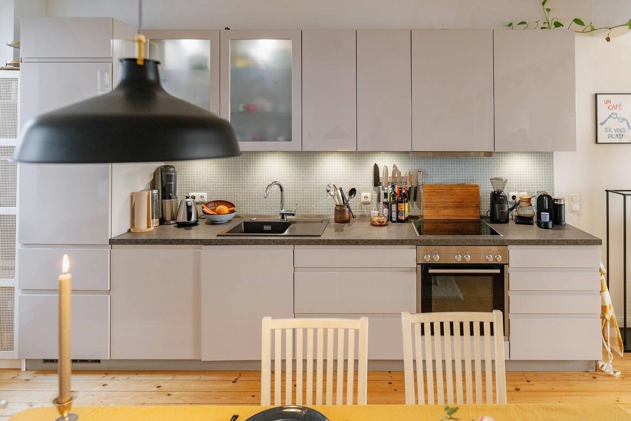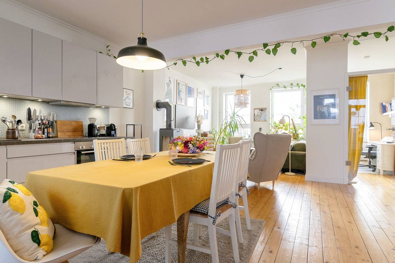 Hereingeflattert ins Traumloft. Atem weg. 9,50 Meter breit, 7,40 Meter lang. Ein einziger großzügiger Raum mit Altbausäule, Pitchpine-Boden, Kaminofen & wunderschönen Nolte-Einbauküche in zartem Grau. Dazu noch total cool eingerichtet von den aktuellen Mietern. Es ist zum Piepen schön! Sie haben Sprossenfenster überall, glatte Wände, neuwertige Elektrik. Kurz gesagt: nichts zu tun. Einfach wohnen.