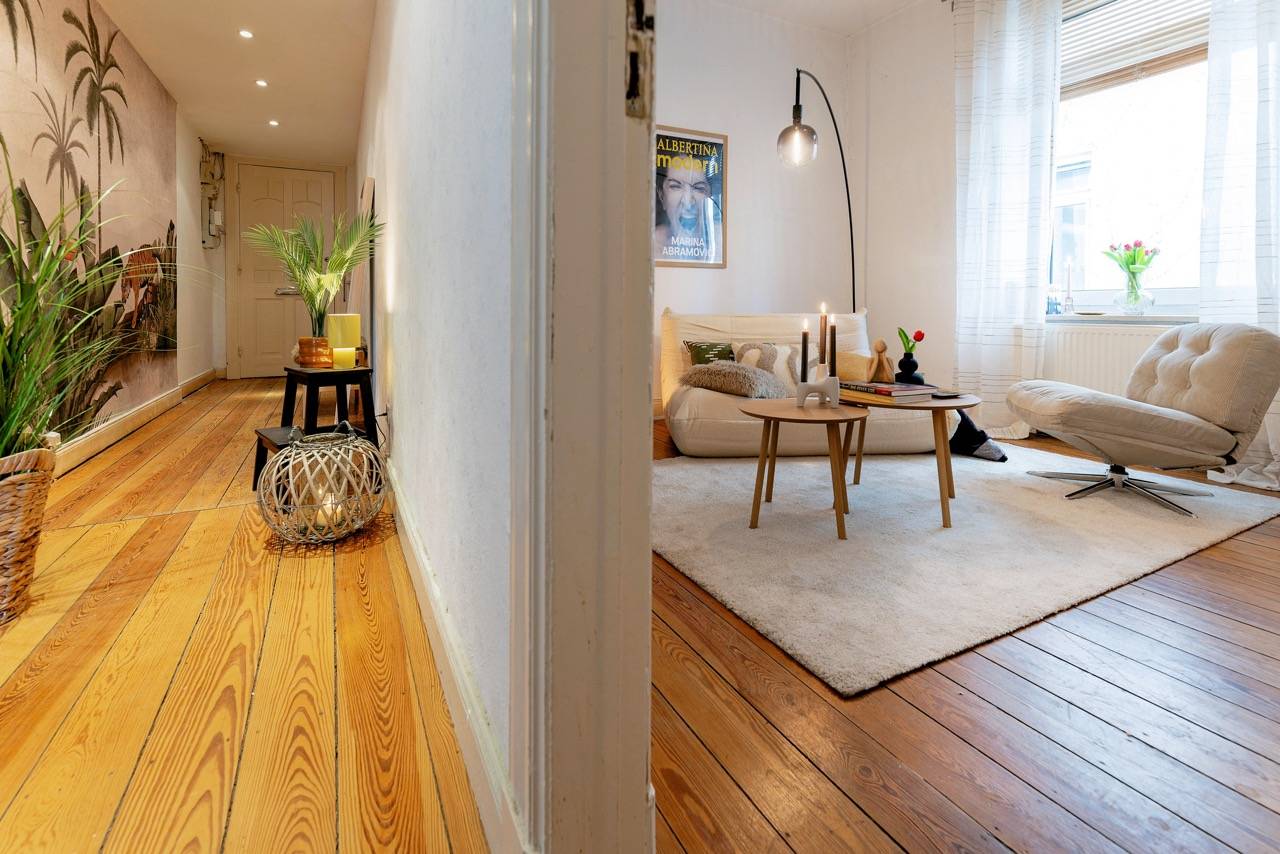 Wie sieht’s hier aus? Das Nest ist okay, aber leicht in die Jahre gekommen. Überall Pitchpine, Originaltüren & Zargen, Originalfliesen in der Küche. Das ist toll. Dennoch könnte man hier mal renovieren. Die Wohnung hat noch Raufaser. Die Lackarbeiten sollten erneuert werden. Die Decke im Flur ist aktuell noch abgehängt, kann aber geöffnet werden. Die Elektrik müsste erneuert werden. Es gibt keine Einbauküche. Fürs Badezimmer gibt es schon 1 neue Duschabtrennung, die Sie selbst installieren können. Kurzum: Das Nest ist klein, aber fein. Es hat schönes Karma.