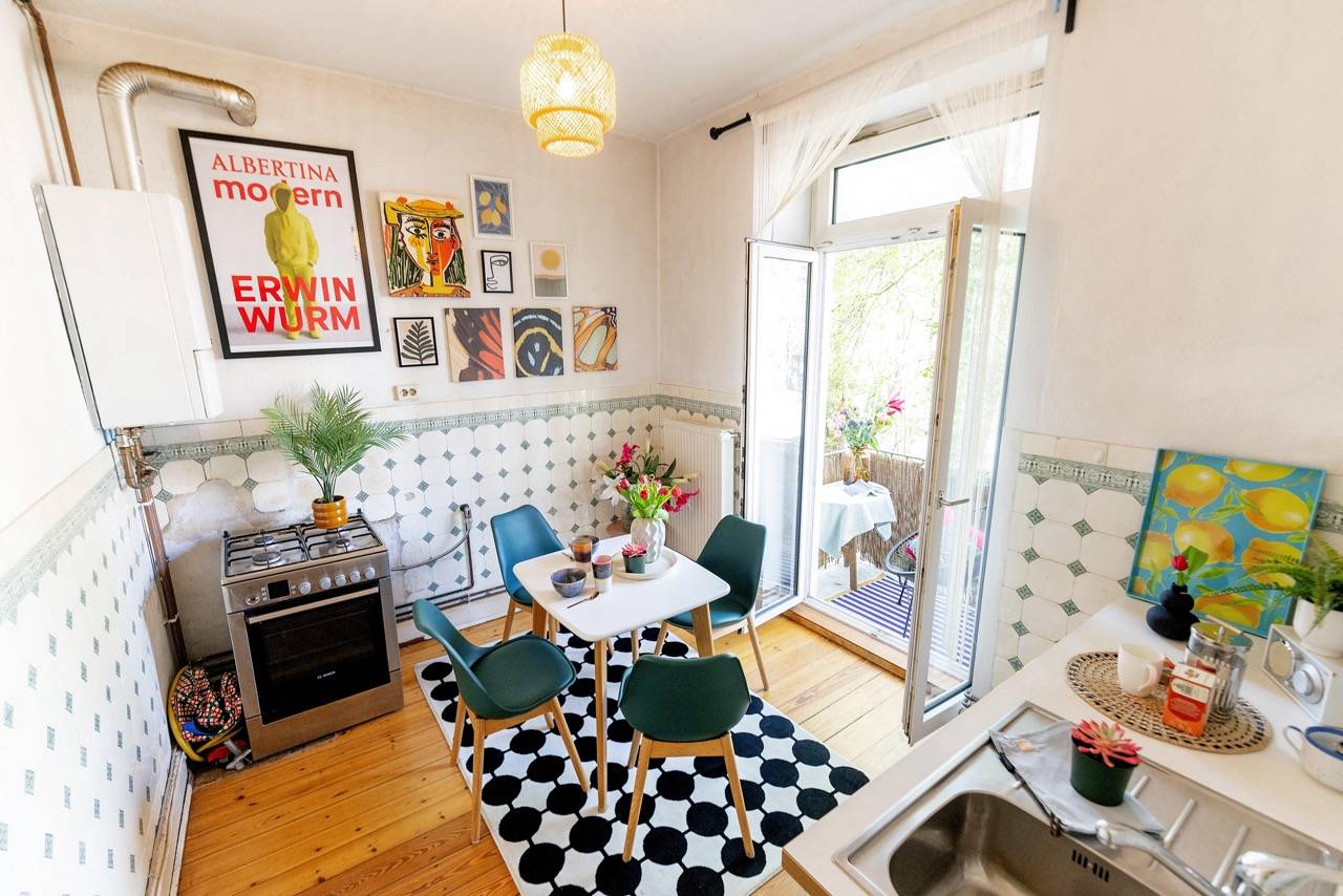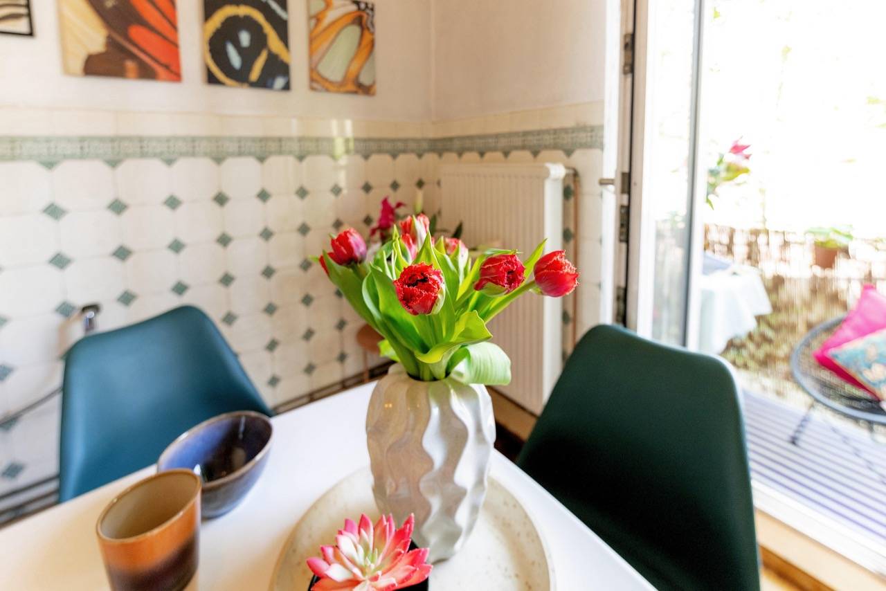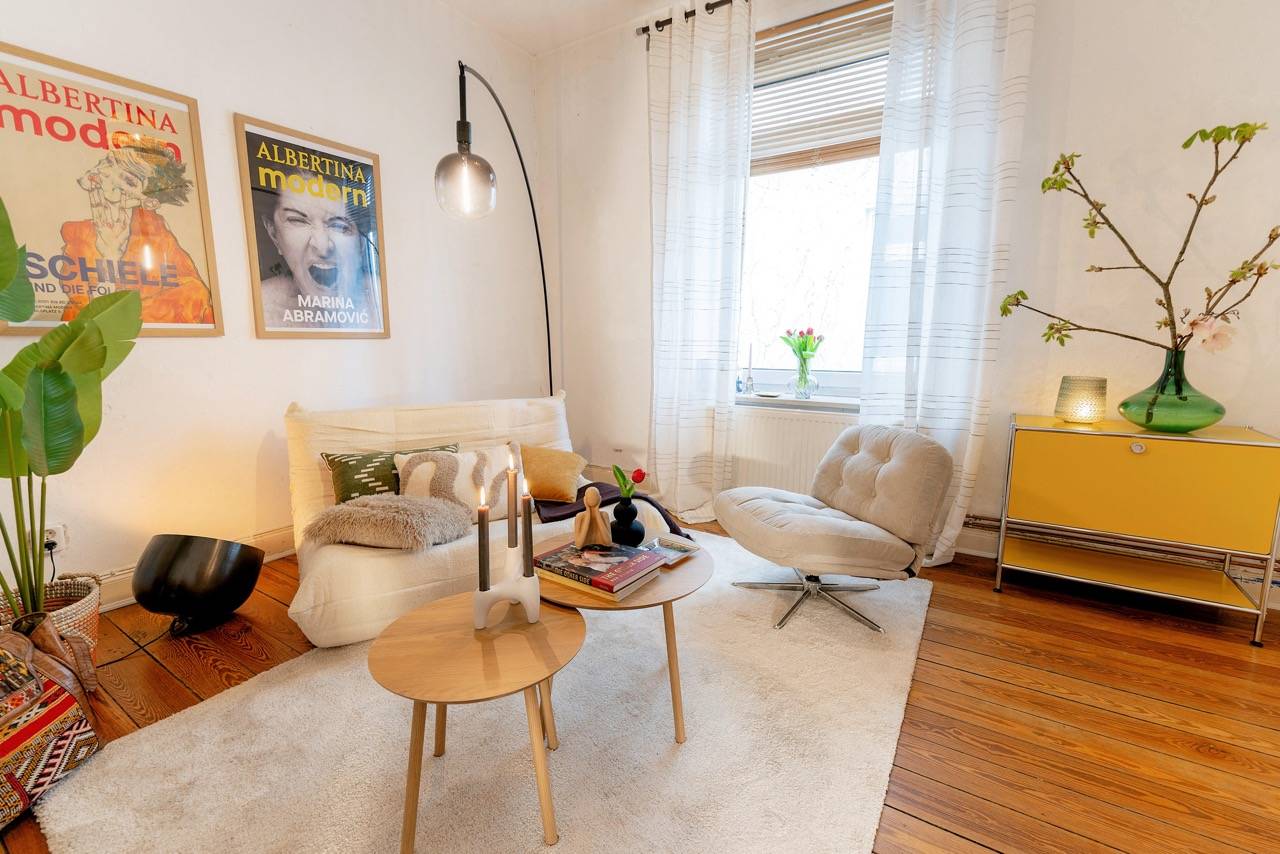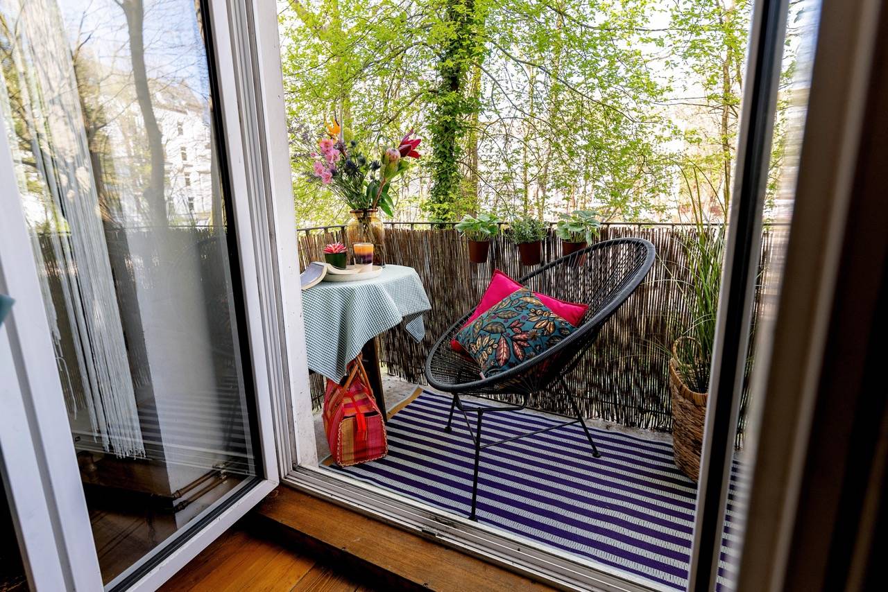 Hereingeflattert! Sie landen im langen Flur mit toller Tigertapete. Wir finden: Das ist Nestglück & verleiht besonderen Charme. Der Flur bietet viel Platz für Stauraum. Links liegt das Wohnzimmer, von uns cool gestylt im 70er-Look. Rechts das Schlafzimmer mit Blick auf den grünen Hinterhof. Vorm Wohnzimmer liegt die Küche, noch mit Original-Fliesenspiegel & der Balkon mit Blick auf den riesigen, baumreichen Innenhof zur Telemannstraße. Hier ist auch 1 Spielplatz. Der Balkon ist groß genug für Tisch & 2 Stühle. Hier gibt’s Sonne am Vormittag bis Mittag. Und viel Zeit zum Chillen.