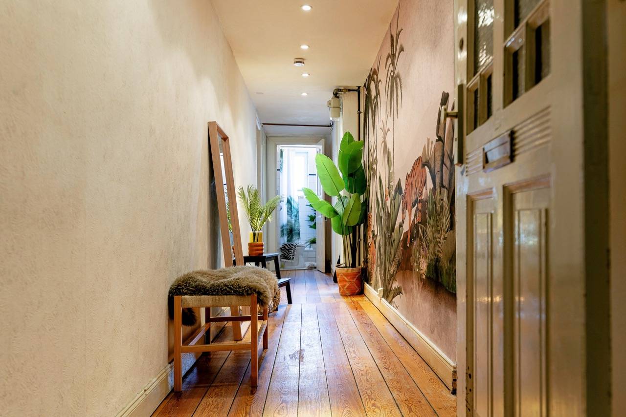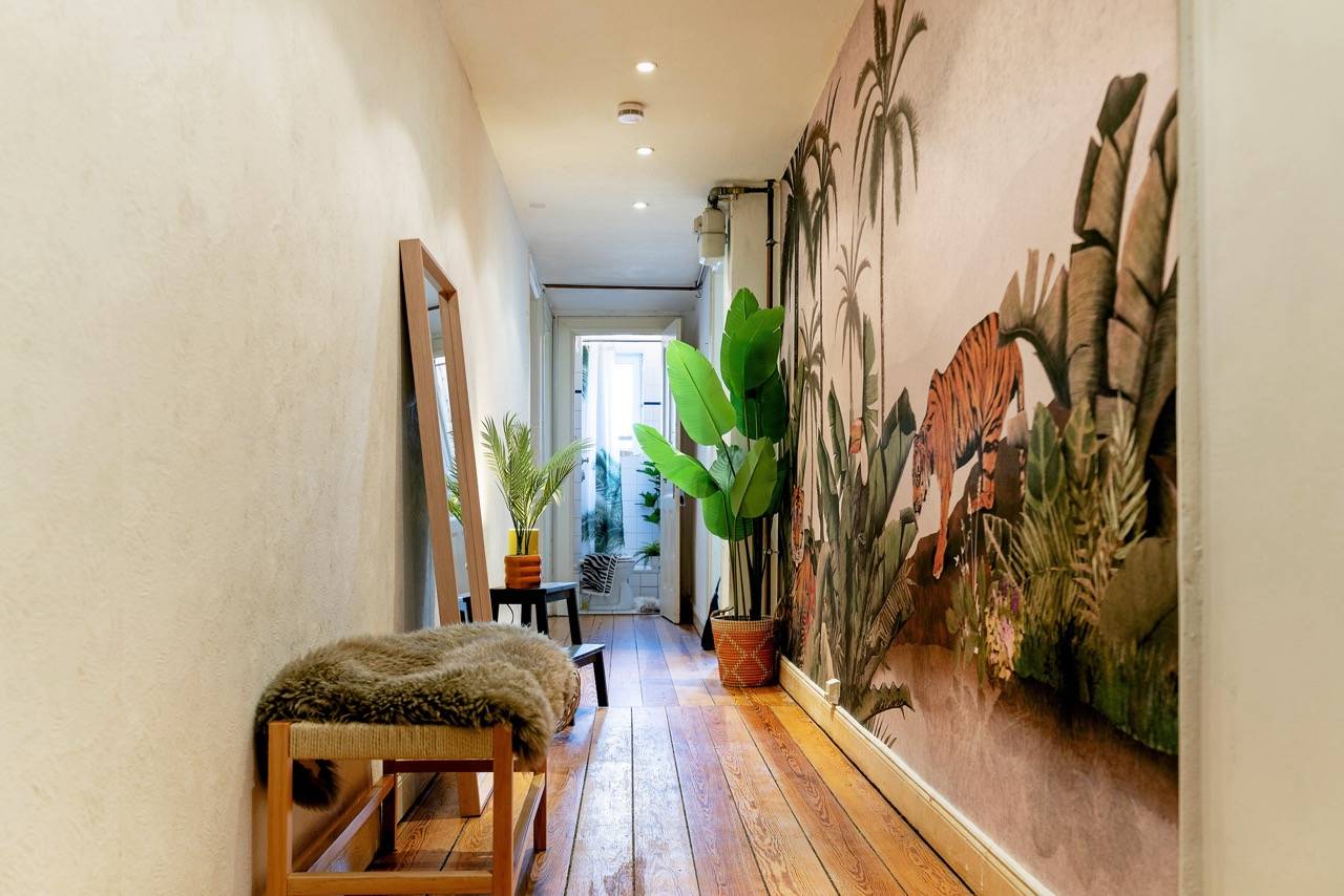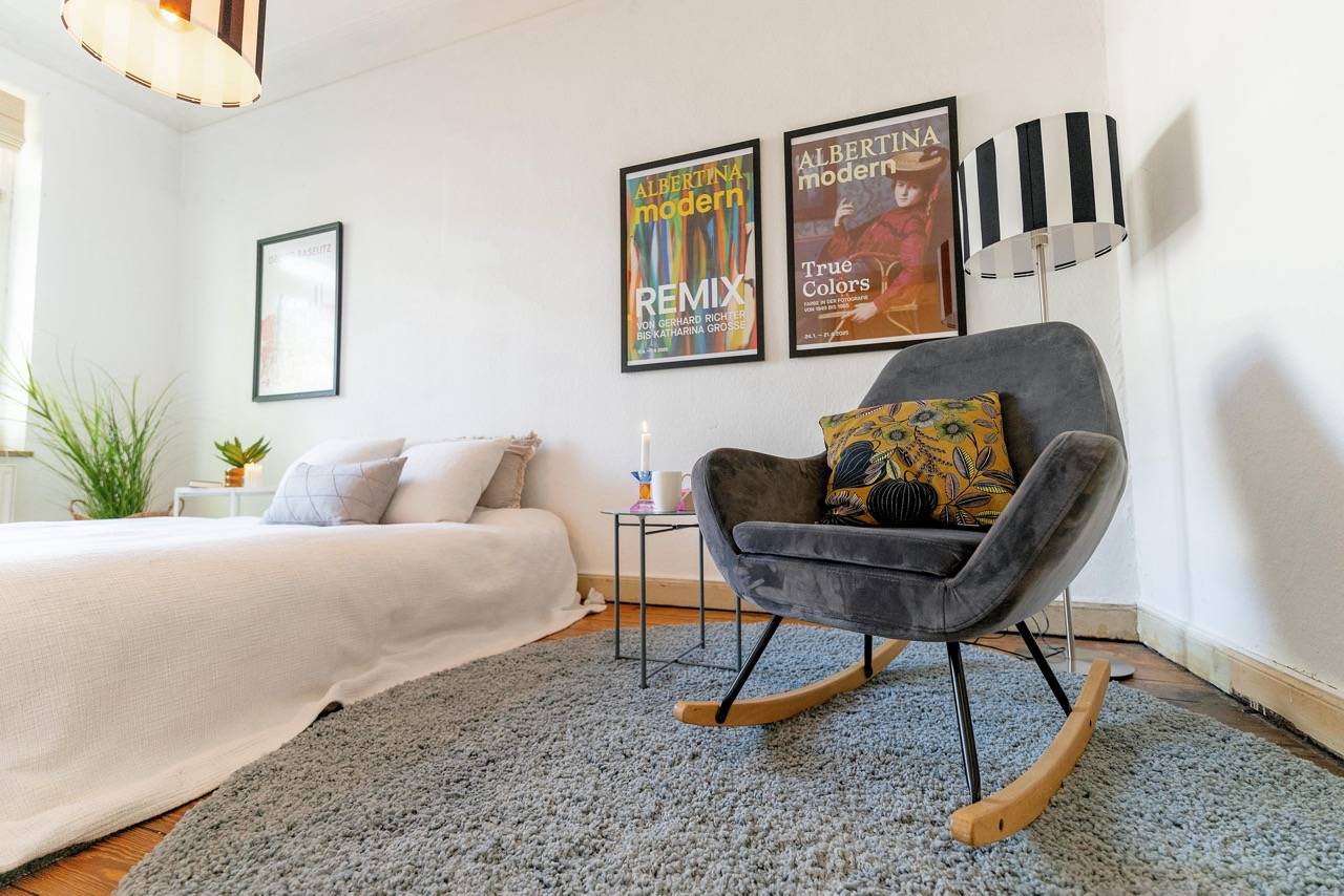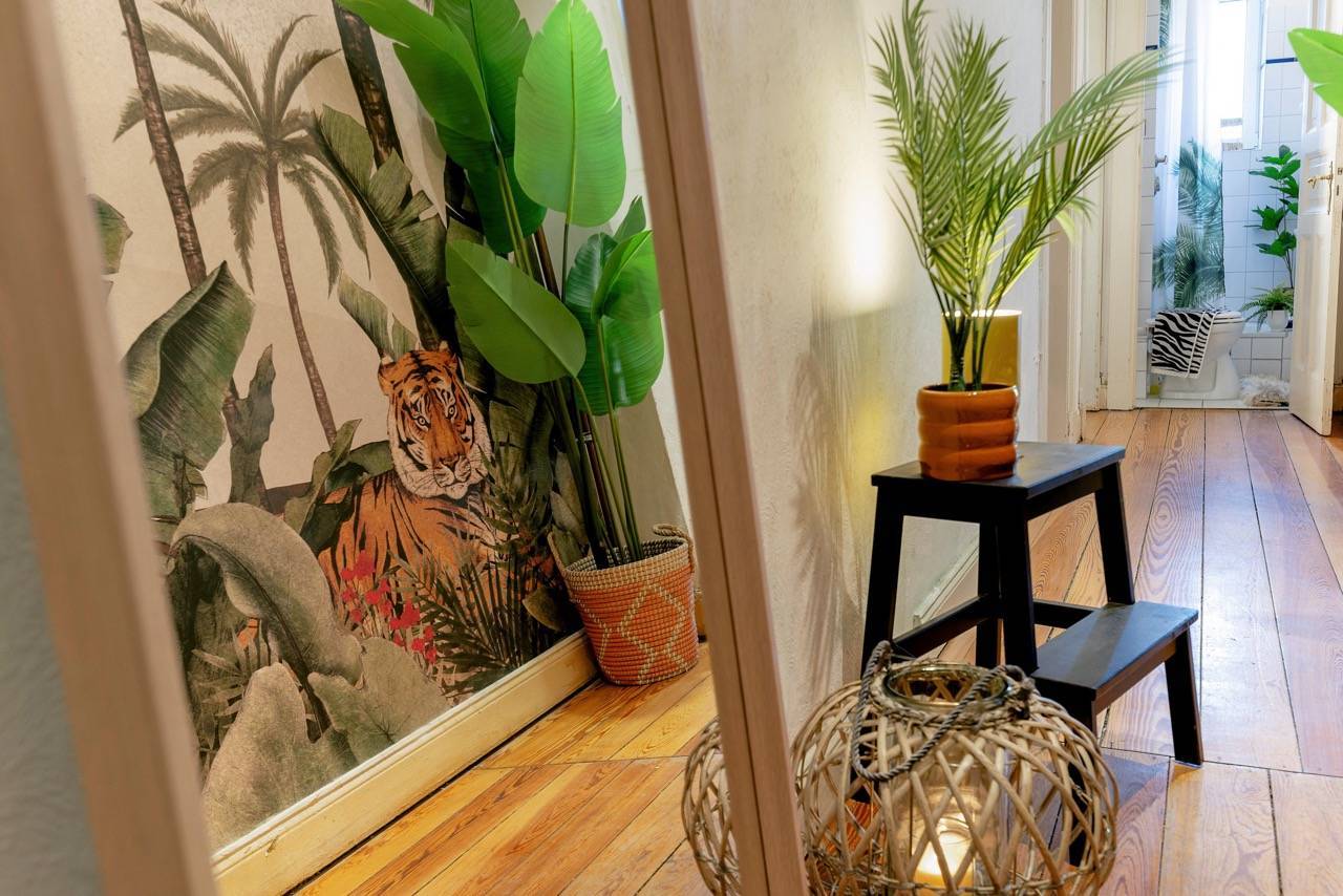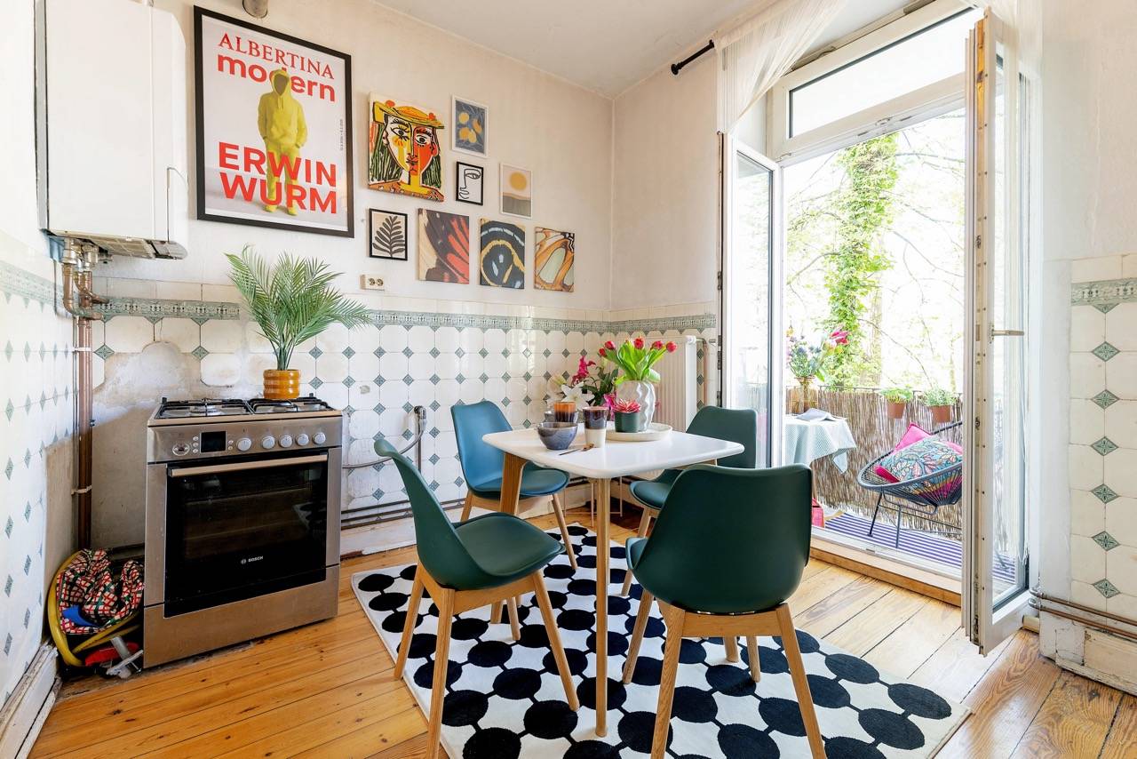 Hereingeflattert! Sie landen im langen Flur mit toller Tigertapete. Wir finden: Das ist Nestglück & verleiht besonderen Charme. Der Flur bietet viel Platz für Stauraum. Links liegt das Wohnzimmer, von uns cool gestylt im 70er-Look. Rechts das Schlafzimmer mit Blick auf den grünen Hinterhof. Vorm Wohnzimmer liegt die Küche, noch mit Original-Fliesenspiegel & der Balkon mit Blick auf den riesigen, baumreichen Innenhof zur Telemannstraße. Hier ist auch 1 Spielplatz. Der Balkon ist groß genug für Tisch & 2 Stühle. Hier gibt’s Sonne am Vormittag bis Mittag. Und viel Zeit zum Chillen.