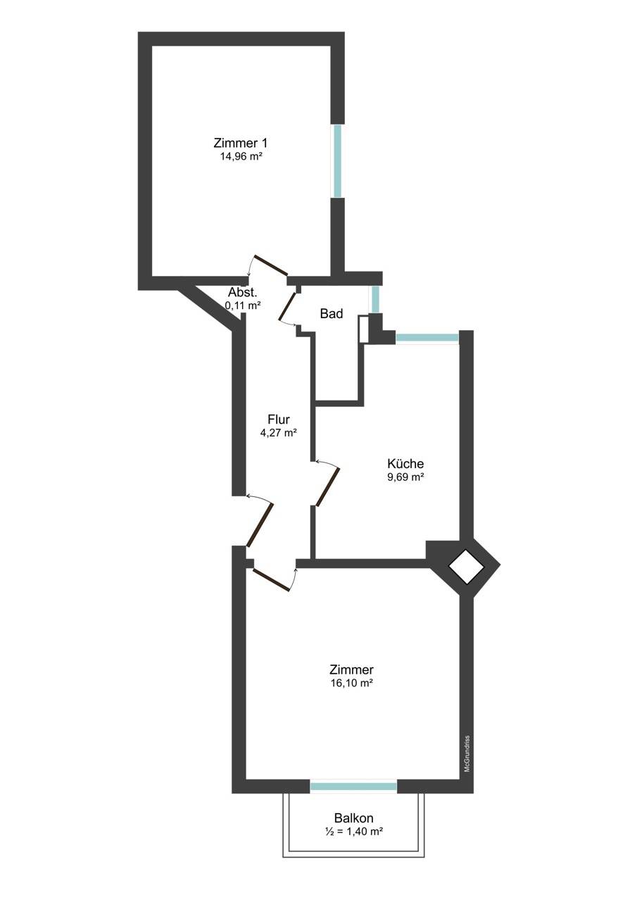 Kleiner Rundflug! Die 2 Zimmer liegen jeweils am Ende des Flurs – nach vorn das Wohnzimmer mit Balkon (ca. 17,5 m²). Mittig die Wohnküche (9,7 m²), 1 Duschbad (sehr klein), die Abstellkammer (noch kleiner). Nach hinten zum Hof liegt das Schlafzimmer (schöne 15 m²). Aber leider mit Blick aufs Nachbarhaus.