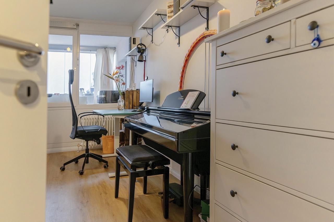 Das Nest in Kürze. Raus aus dem Fahrstuhl, um die Ecke, rein ins Nest. Angekommen liegt links das Vollbad, rechts die Abstellkammer. Das Bad ist neu. Schräg links geht’s ins Schlafzimmer (16 m²) – Schrank, Bett, Kommode, finden hier Platz. Geradeaus kommen Sie ins kleine Kinder-/Arbeitszimmer (10 m²). Schräg gegenüber das Gäste-WC mit Waschmaschinen-Anschluss. Und dann gibt’s nur noch die offene Wohn-Ess-Küche mit nagelneuer Küchenzeile in Weiß (36 m²). Alle Wohn-/Schlafräume & die Küche haben Fenster zur Loggia.