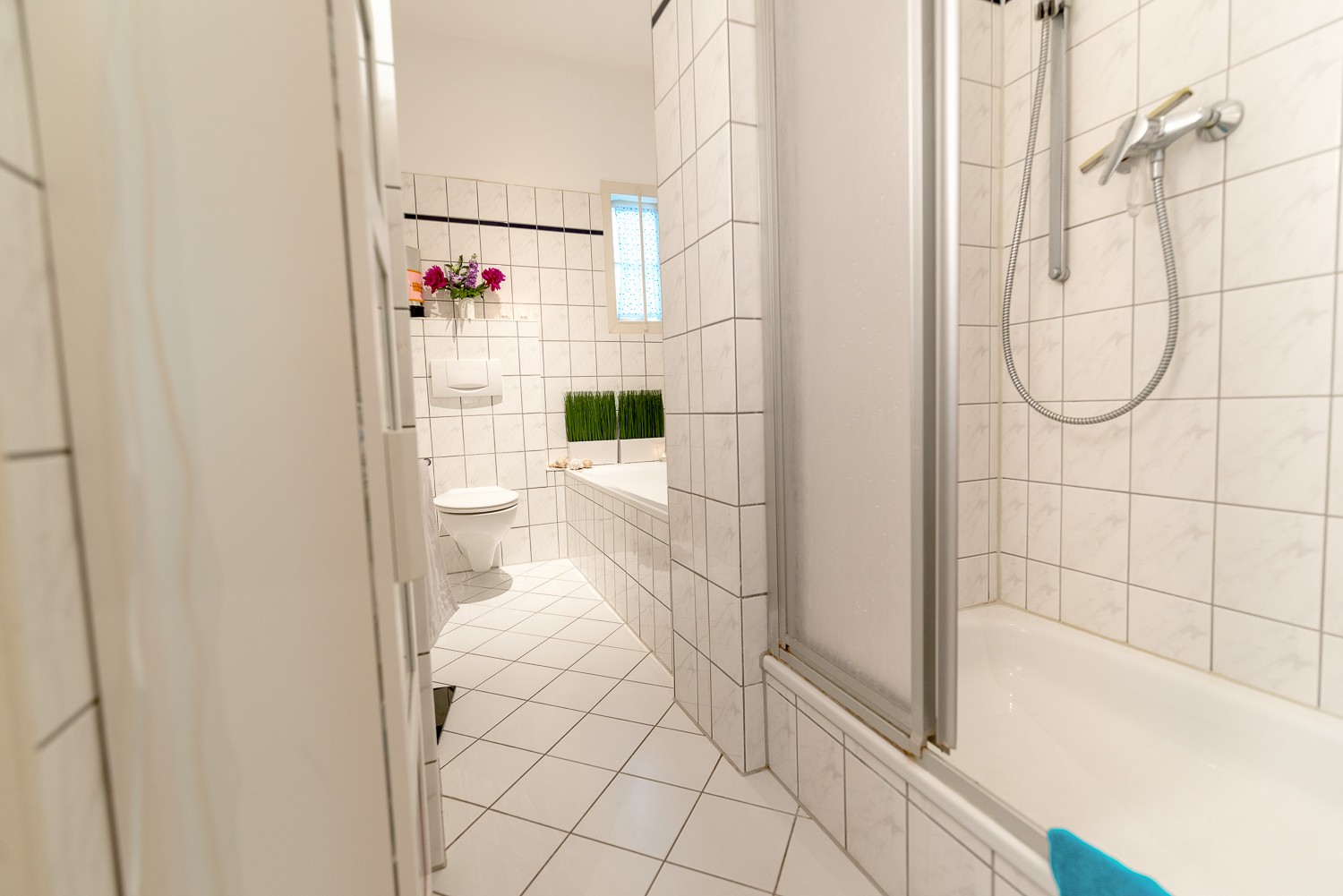 Die Bäder sind okay, könnten aber renoviert werden. Das Vollbad ist weiß gekachelt und mit Toilette, Wanne und Dusche ausgestattet. Davor liegt Ihre Gäste-Toilette.